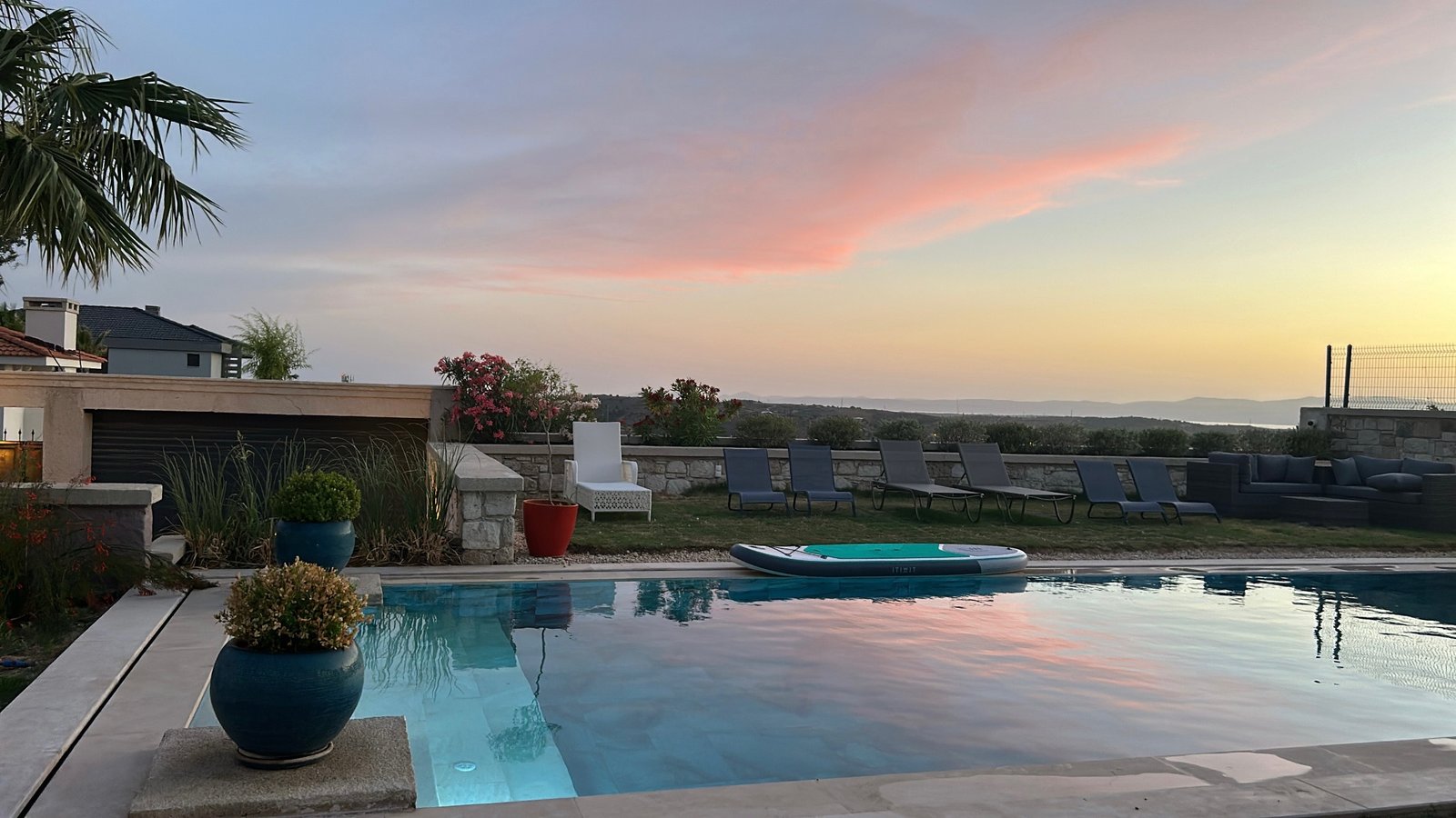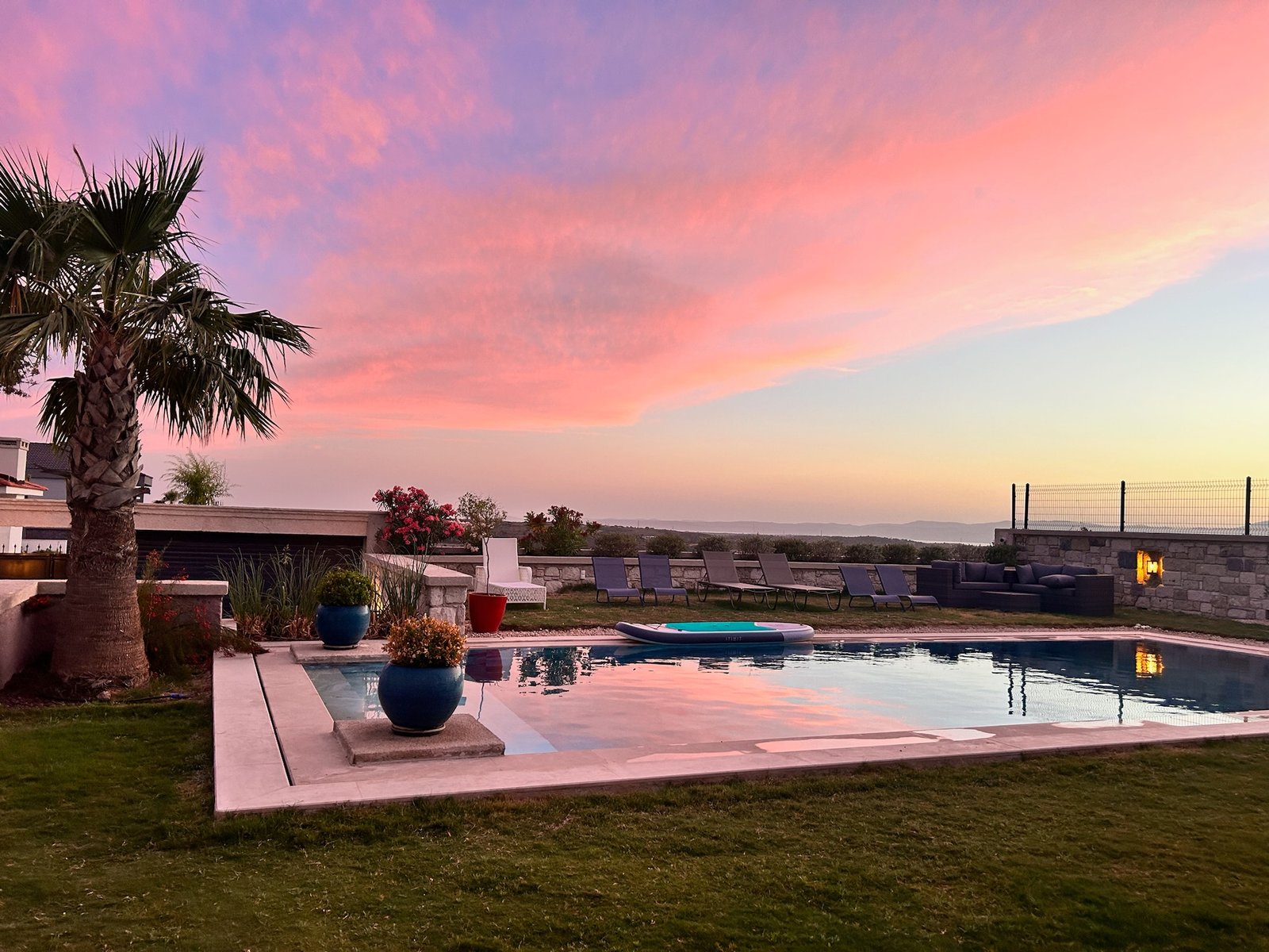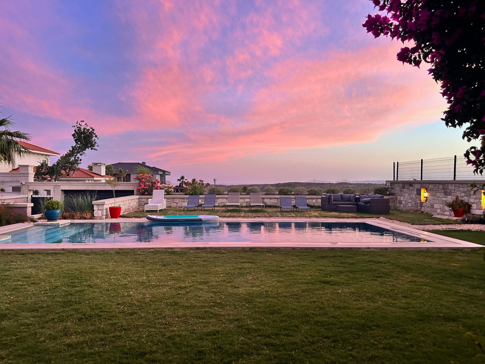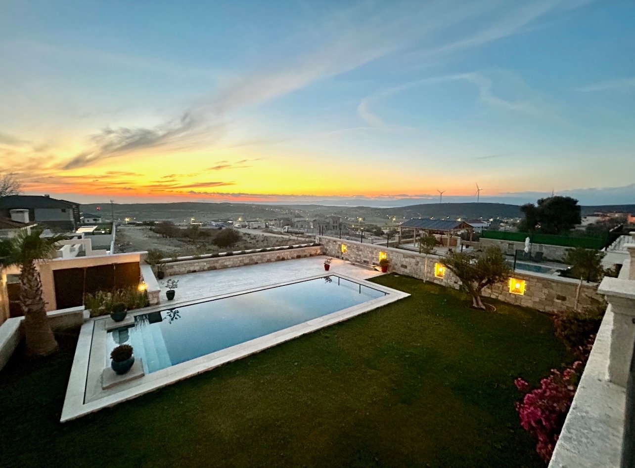 12×5 metre büyüklüğündeki özel yüzme havuzu, geniş bahçe alanı ve gün batımını izleyebileceğiniz teraslarıyla villa, sevdiklerinizle keyifli vakit geçirmeniz için tasarlanmıştır.