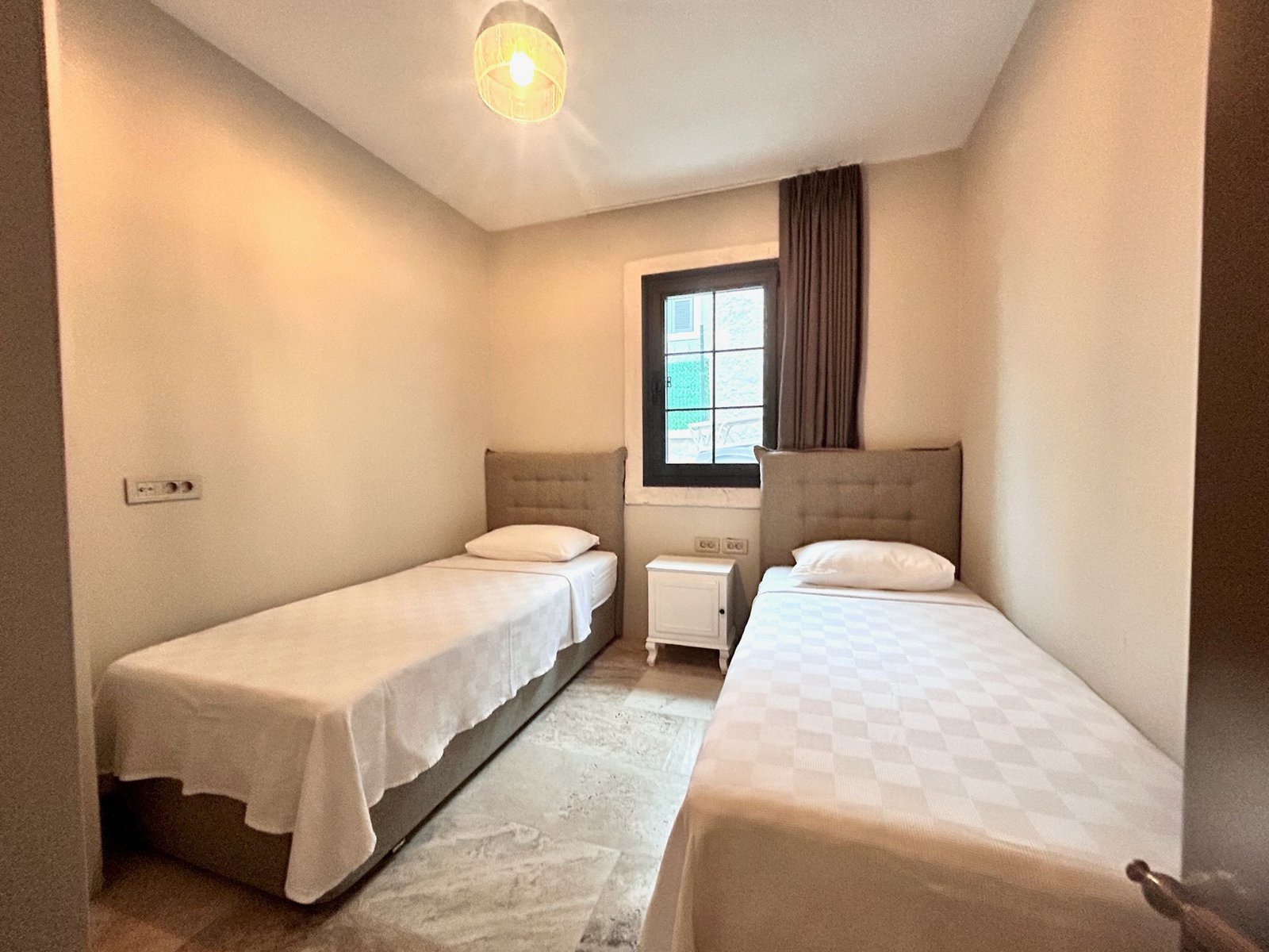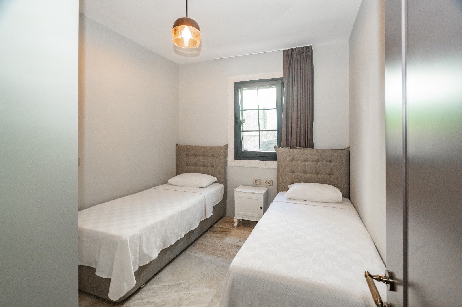 400 m² yaşam alanına sahip villa; 6 yatak odası, 6 banyo, geniş ve ferah bir salon ile tam donanımlı mutfağıyla 12 kişilik konaklama kapasitesine sahiptir. Her odada klima, yerden ısıtma ve şömine bulunur.